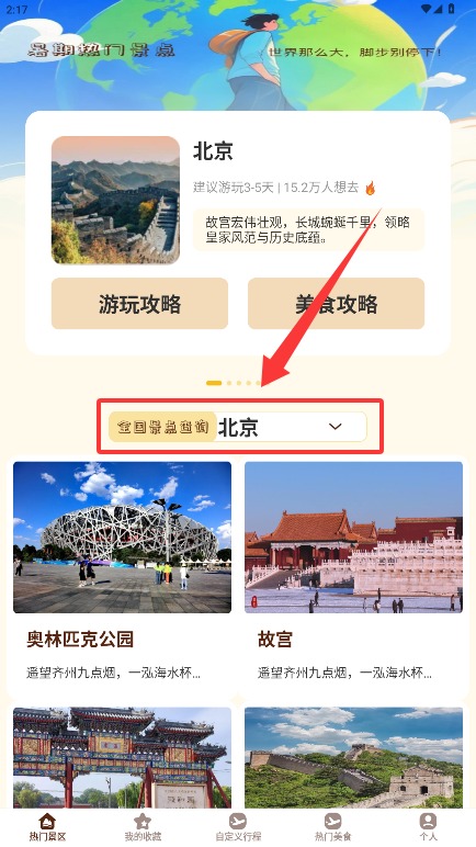 2、在推荐景点页面选择目的地城市后,系统会自动筛选显示当地热门旅游景点信息。