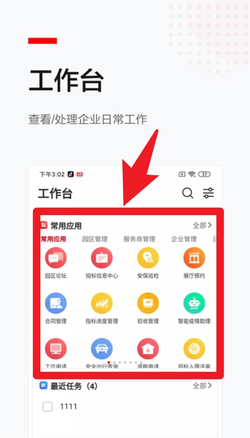 4. 工作台集中展示常用功能入口,如园区管理、服务商管理、会议预约等企业日常事务模块。