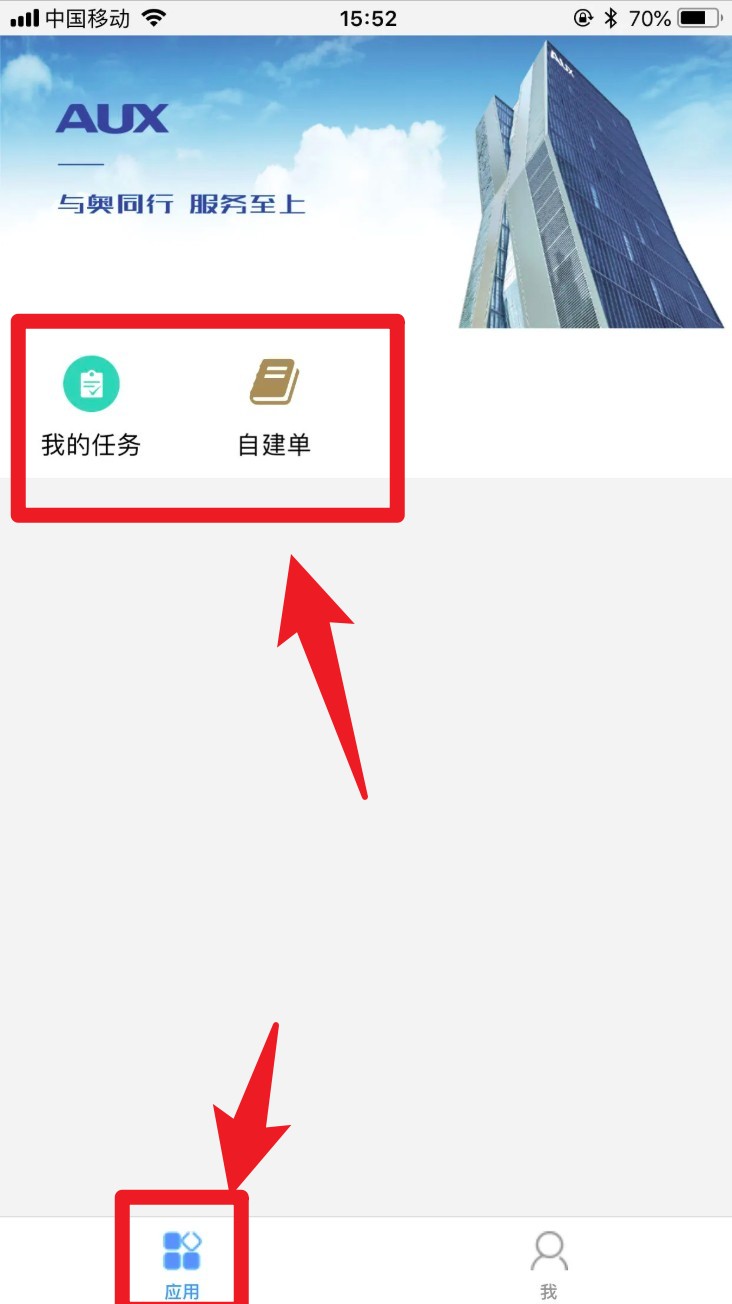 1. 在首页底部点击应用进入主操作区,可看到我的任务与自建单功能入口,服务工程师可在此创建工单。