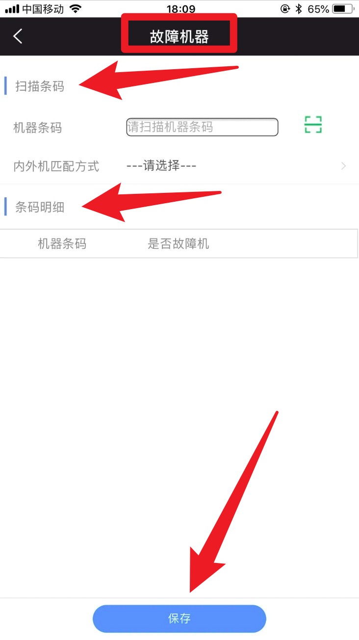 3. 如需报修故障设备,进入故障机器页面,手动输入条码,选择内外机匹配方式,补充说明后点击底部保存。