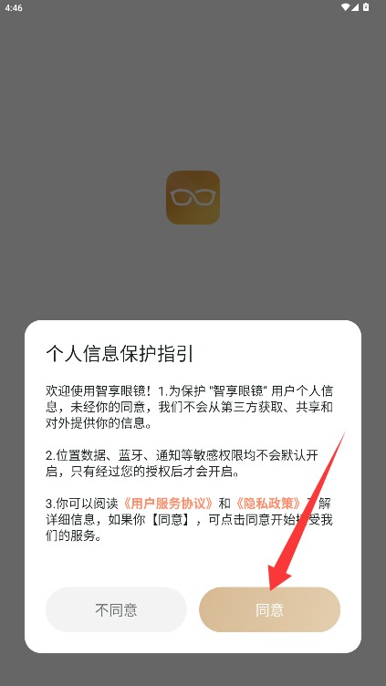 1、新用户首次启动需阅读并同意服务条款与隐私政策,同意后进入应用主界面。