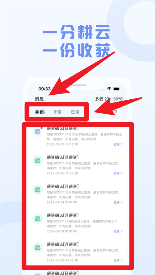 2、点击消息栏,可查看所有未读或已读通知,便于及时了解薪资确认及系统公告。