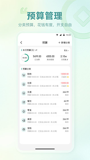 2、分类预算:提供多种预设收支类别,如餐饮、交通、工资等,并允许自定义新增;同时可设置月度或分类预算,超支时及时提醒。