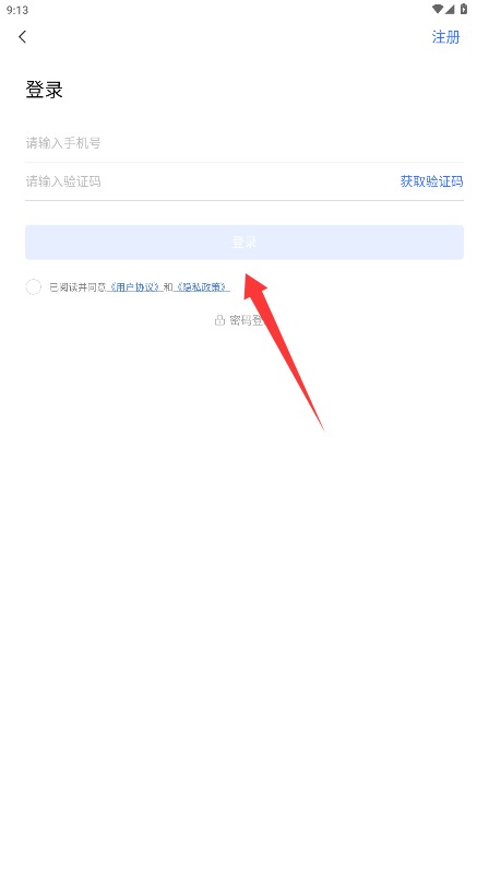 1、在登录页面填写手机号码,勾选用户协议后获取并输入验证码,点击登录进入。
