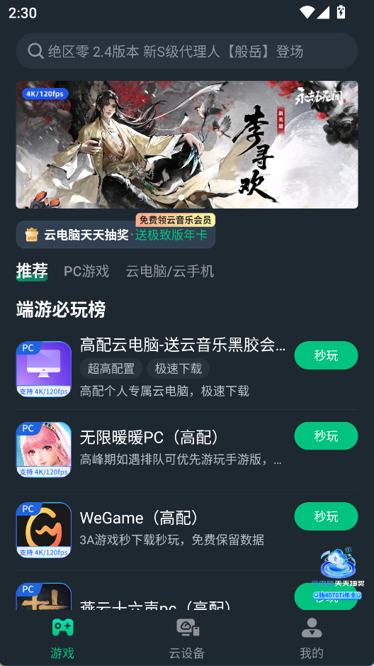 网易云电脑是一款移动端游戏助手,可以远程访问云端高性能电脑环境,在线游玩各种热门PC游戏,让日常娱乐休闲变得更方便,不在待在电脑前也能畅玩,具备低延迟、高画质的特点,能登录个人游戏账号,带来灵活便捷的使用感受。