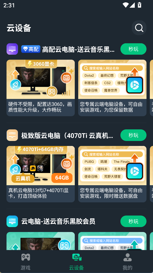 2、无需本地安装:所有软件和游戏直接在云端运行,不需要下载到设备中,避免占用手机存储空间。