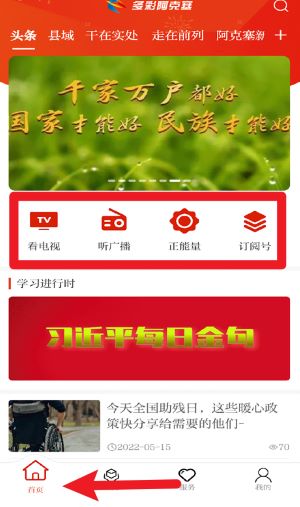 1、在首页页面中可点击看电视、听广播等栏目,快速获取本地资讯与多样文化内容。