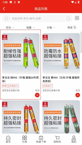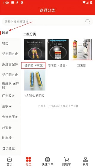 2、选择【胶类】分类下的硅酮胶(软支)品类,进入对应商品列表页面。