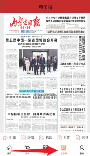 3、点击电子报模块可浏览《内蒙古日报》数字报纸,支持封面、版面、标题、往期报纸在线阅读。