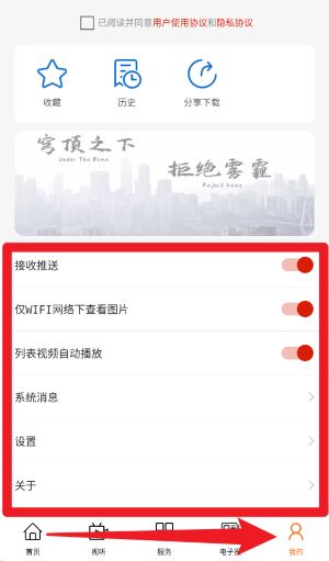 4、在我的界面中可查看收藏、历史记录、设置通知推送、管理视频播放模式与隐私偏好设置。