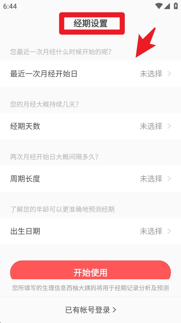 1. 初次进入应用时,填写最近一次月经开始日、经期天数、周期长度及出生日期,点击开始使用完成基础设置。