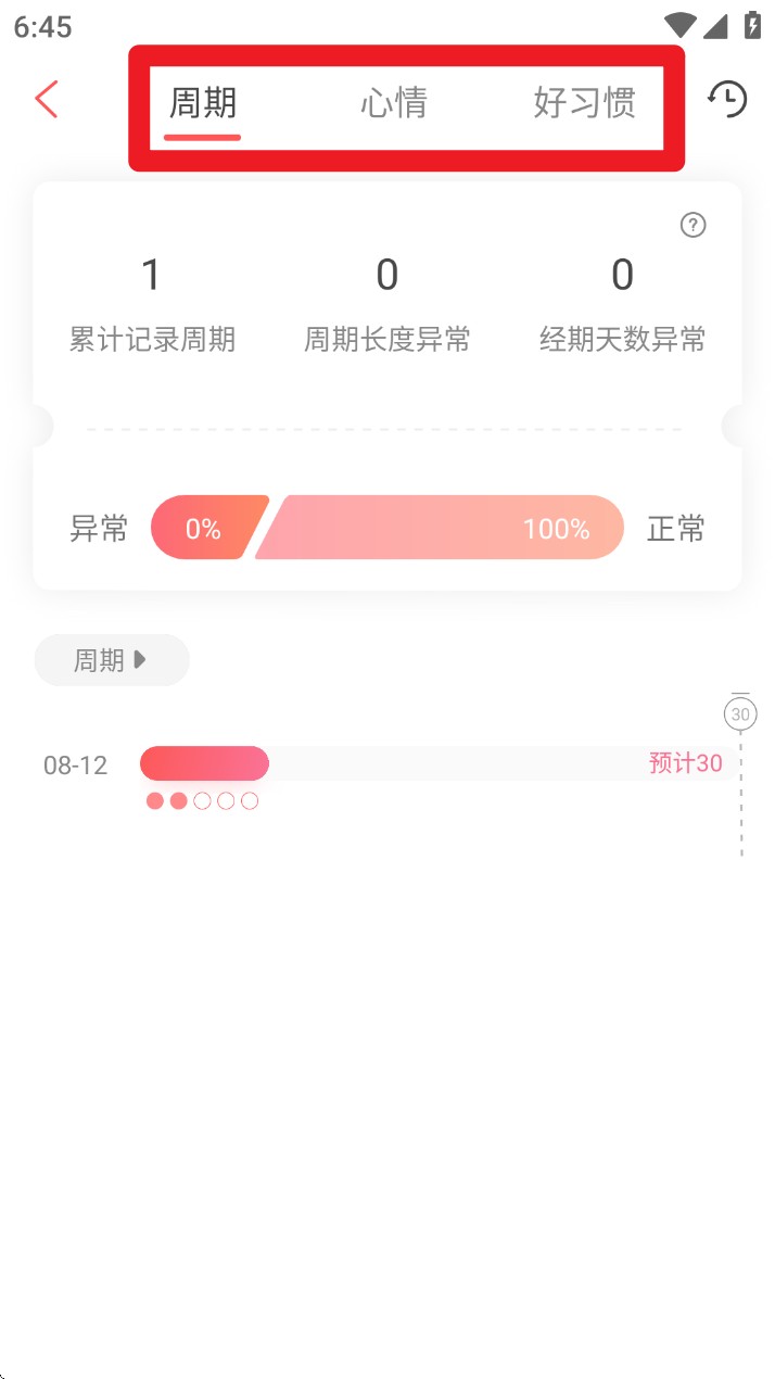 3. 点击右上角统计进入周期分析页,查看周期长度、天数异常等数据统计,帮助判断经期规律。