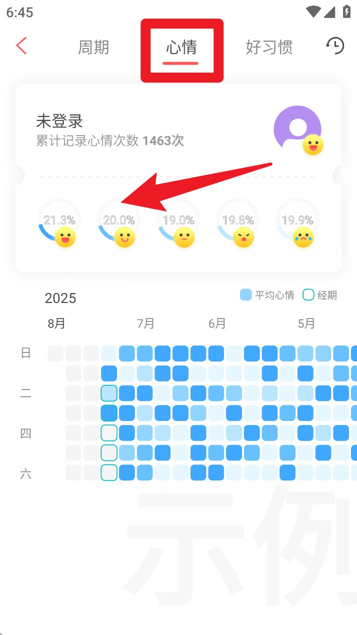 4. 切换到心情标签,选择当天心情并查看情绪变化趋势,还能对比平均心情与经期的关联。