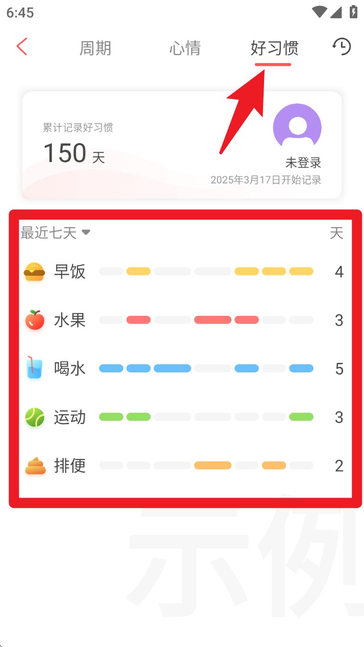 5. 在好习惯页面记录每日早餐、水果、喝水、运动及排便等健康习惯,形成统计数据,方便长期跟踪管理。