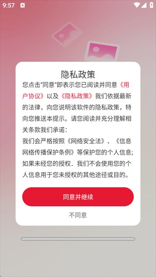 1、打开推搪壁纸,阅读用户协议与隐私政策后,点击同意并继续;