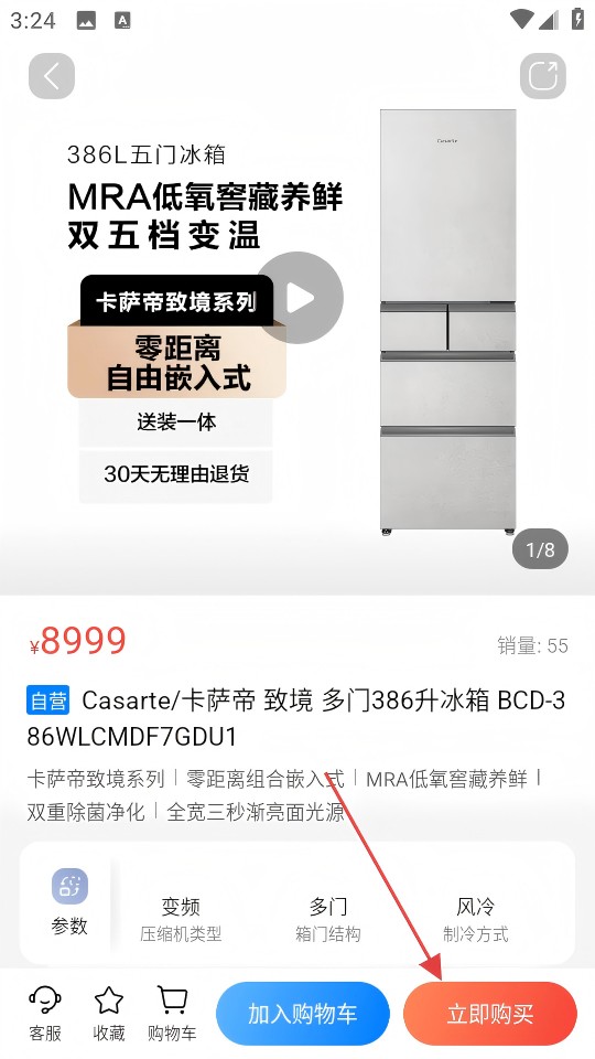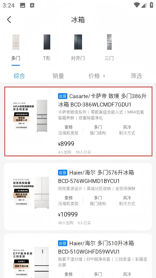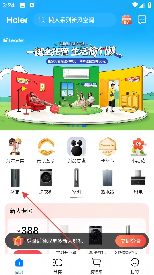 1、点击首页【冰箱】分类入口,直接进入冰箱产品列表页面;