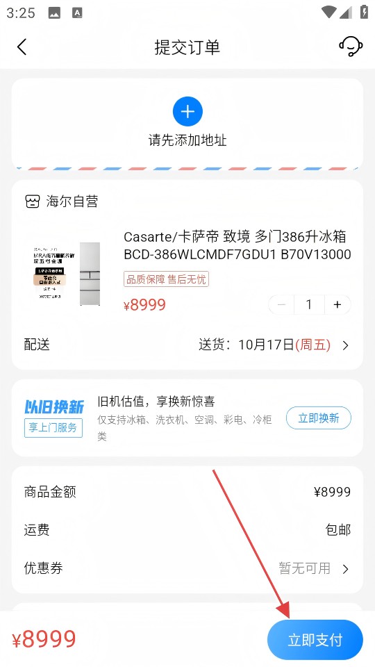 4、在提交订单页面完成地址添加后,点击【立即支付】,即可完成冰箱购买操作。