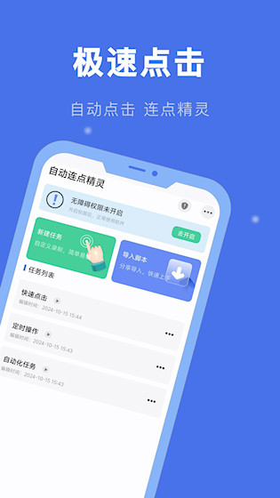自动连点精灵是一款自动化操作工具,可以实现屏幕的连续点击、滑动和组合手势等重复性操作,无需获取复杂权限,不依赖网络连接,通过直观的界面和悬浮控制球快速设置点击位置、频率与时长,轻松完成从简单点击到复杂任务自动化的配置。