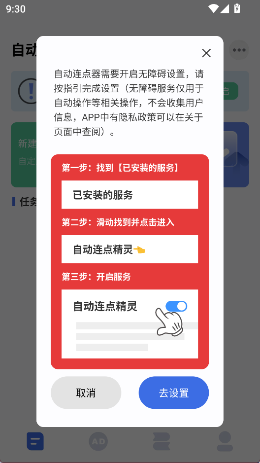 3、悬浮球便捷控制:配备可拖动、透明度可调的悬浮按钮,随时启动或暂停任务,不影响其他应用使用。