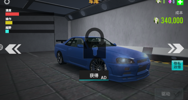 4、然后我们可以进入到车库中,可以看广告,或者是使用我们赚取的金币去解锁更多的车辆的。