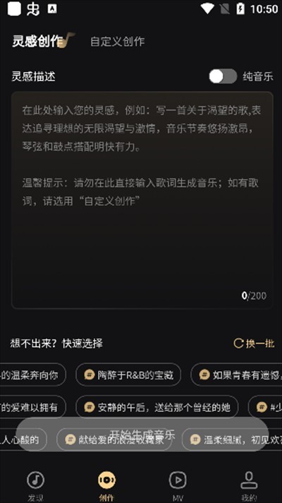 1、无需复杂设备与专业基础,依托智能功能轻松生成旋律、歌词与配乐,体验完整创作流程。