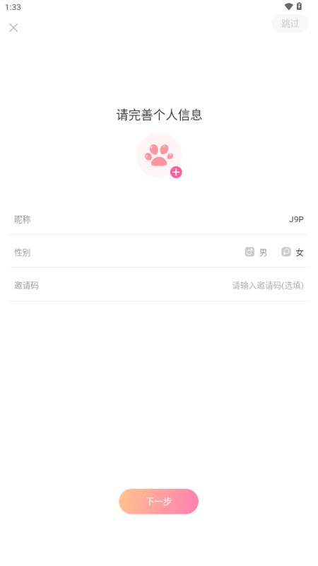 5、登录成功后,填写个人昵称并选择性别,完善基础信息。
