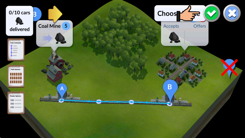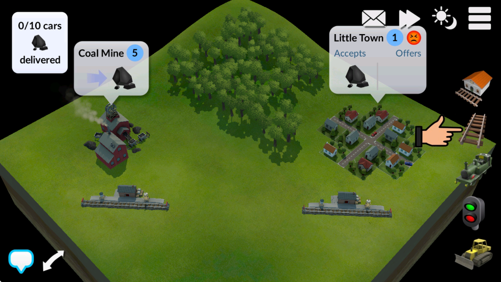 1、让我们先在煤矿站和小镇站之间铺设一条铁路轨道。要建造新轨道,请选择屏幕右侧的轨道图标。然后在两个车站之间绘制轨道。
