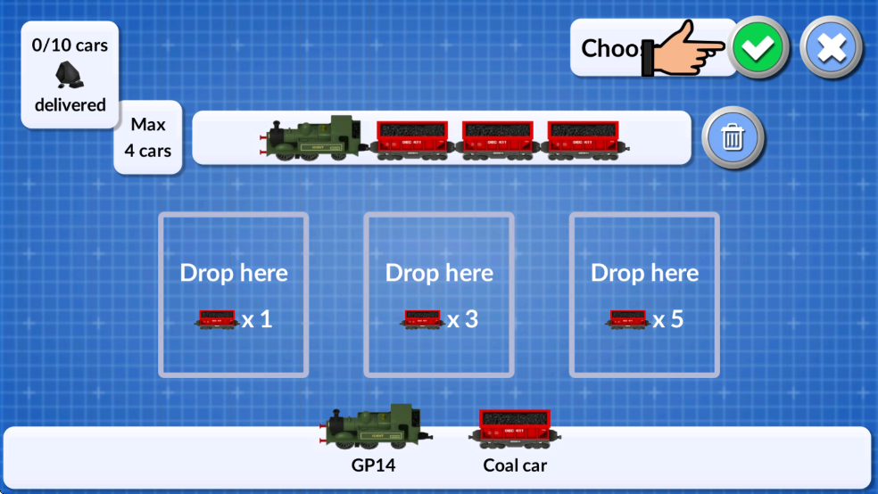 4、路设置完毕后,可以创建一列新火车了,要为火车添加煤车,请将煤车拖拽到其中一个下拉框中,至少添加一节煤车后,点击确定按钮。