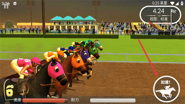 2、比赛开局点击右侧【加速!】按钮,提升马匹速度的同时,留意【速度-耐力】条,平衡属性维持冲刺。