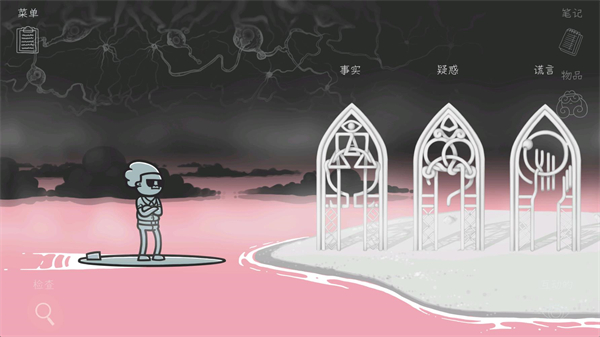 4、在心灵世界里有三个门可以让你调查,分别会向你展示一个事实、一个疑惑和一个谎言,你需要进入这些门里来寻找线索。