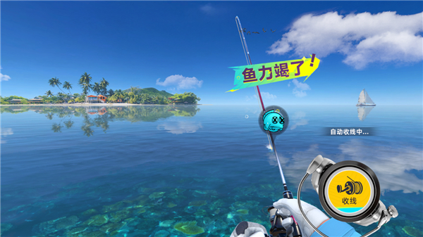 为了防止鱼游向远处,玩家需不断点击收线。点击收线时应尽量保持张力指针处于黄色区域内,以最大限度消耗鱼的体力。