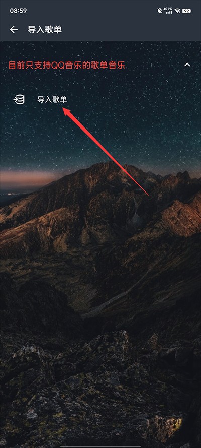2、在弹出的相关选项中,点击“导入歌单”选项,进入歌单导入操作界面。