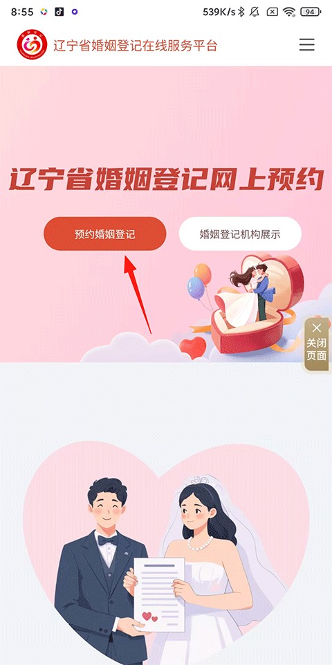 2、进入对应页面后,找到并点击“预约婚姻登记”按钮,启动预约流程;