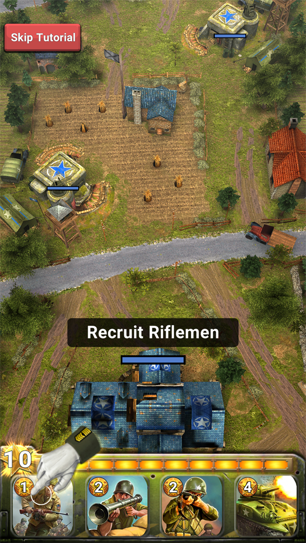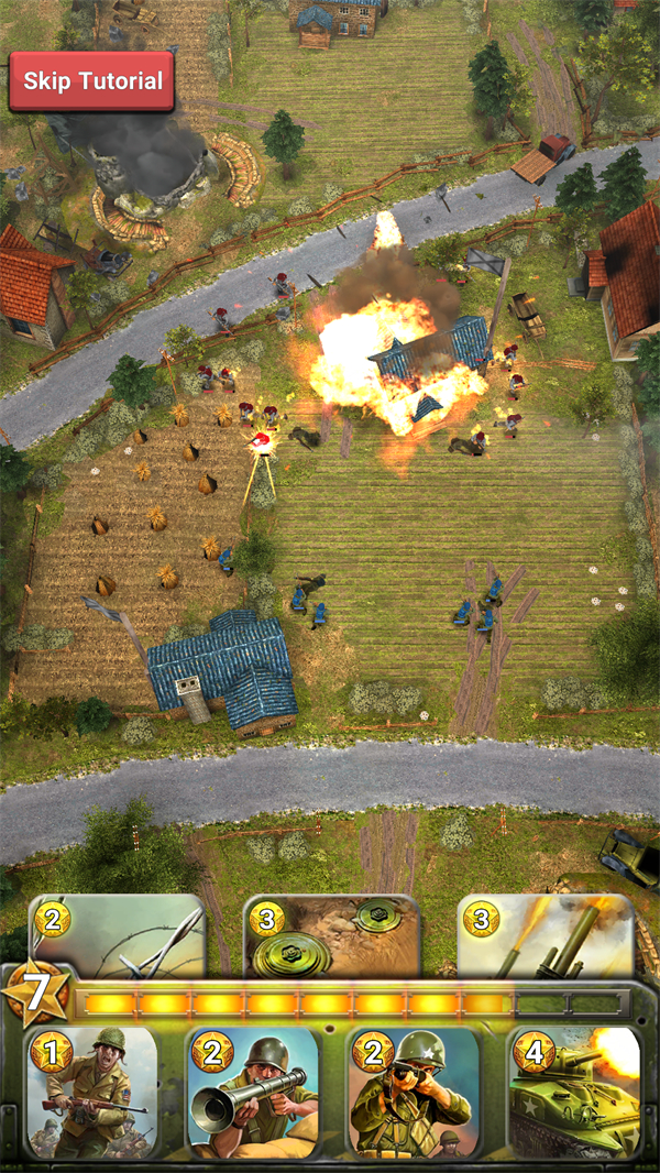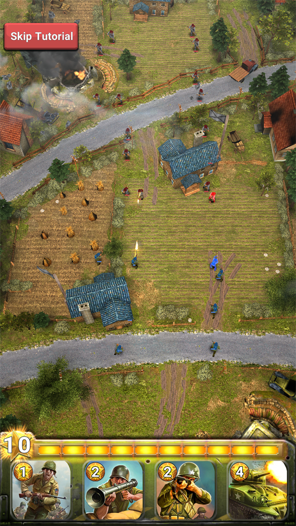 玩家可配置最多8张战术卡与4支部队卡,通过雷区、空袭、空投等战术手段强化进攻或构筑防线。