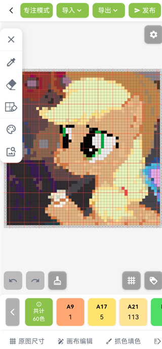 提供画笔、橡皮擦等基础工具,支持对单个像素点进行修改,同时可多指缩放查看细节,确保图案还原度和创作自由度。