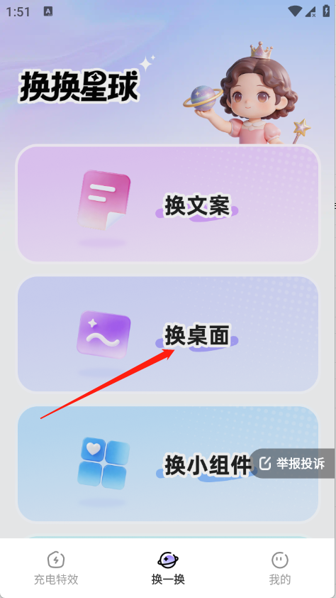 2、进入软件后找到“换一换”页面,在页面中点击“换桌面”选项,开启桌面美化。