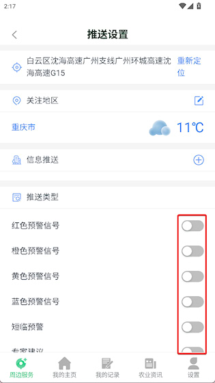 3、开启需要推送的预警类型