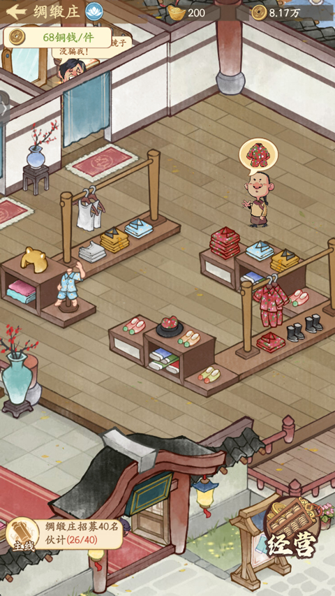 2、建造好后进入店铺,玩家可点击经营来招募员工、解锁商品来赚取铜钱;
