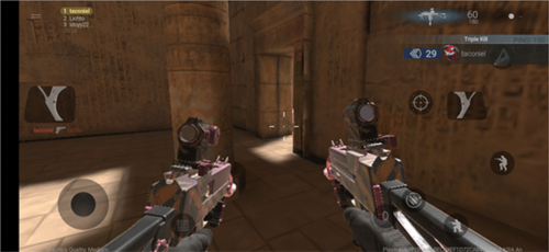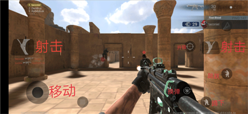 2、匹配成功后会直接进入游戏,然后通过左下角轮盘操控角色的移动,左右两边的扳机为射击,以及换弹、蹲下、跳跃等按钮去击杀敌人;