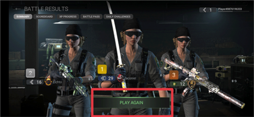 5、最后游戏结束后你还可以查看自己的战绩,若还想和队友再玩一局可以点击play again;