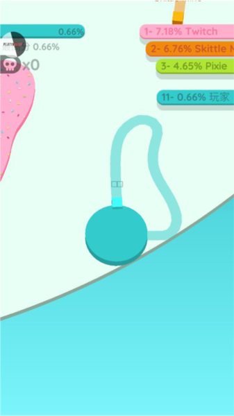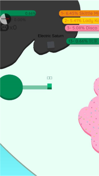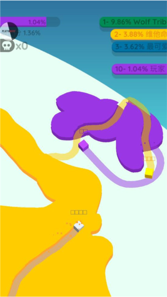 4、行进过程中需要格外谨慎,当你离开自己已占领的领地时,身后会留下一条代表自身颜色的虚线轨迹,一旦被其他玩家触碰,就会面临失败风险。