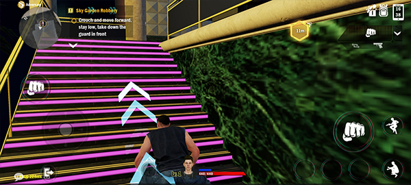 3、点击右边的下蹲动作,弯腰悄悄上楼。