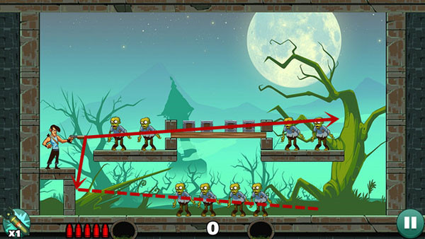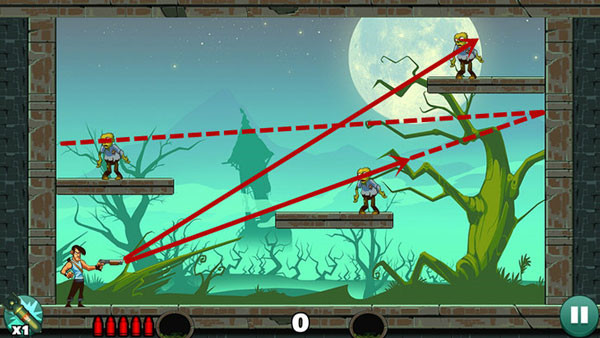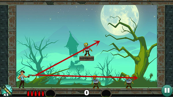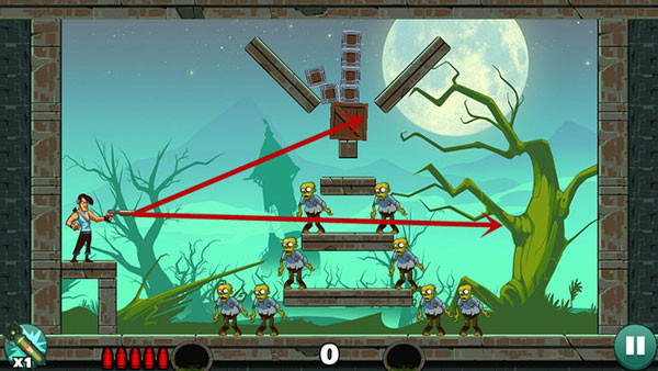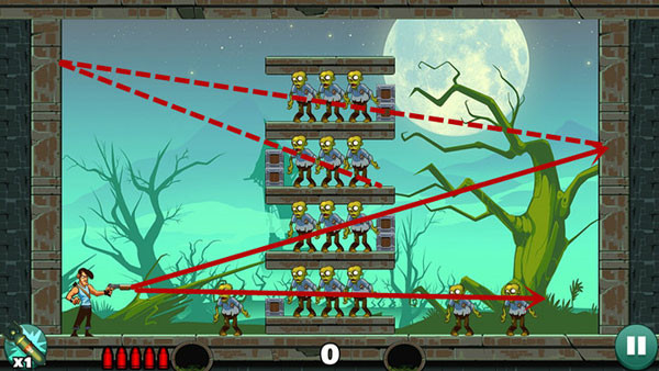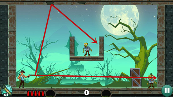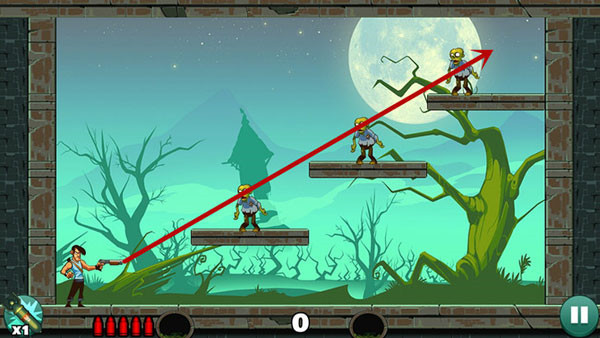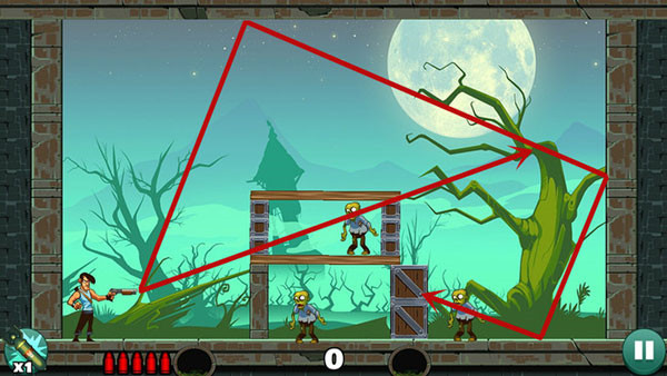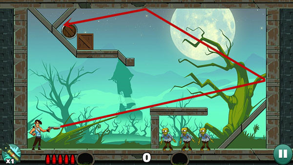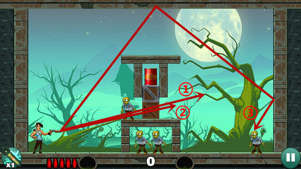 这关过起来最容易,没什么技巧,直接瞄准僵尸射击即可,如果想一发子弹过关不妨多试试不同的角度。