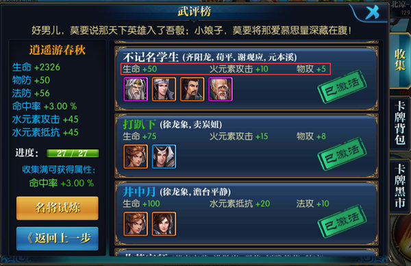 卡牌系统有多种不一样的方式,需要选择适合自己自身所选职业的契合属性进行激活,激活成功后不仅可以提升大量战力,还会使在实战中的表现更加强大。而且卡牌还有多种不同的获取方式,最直接的就是在江湖系统中进行抽取,可以选择银子或者金子进行,银子抽取获得白绿蓝卡牌,金子抽取获得紫橙红卡牌。