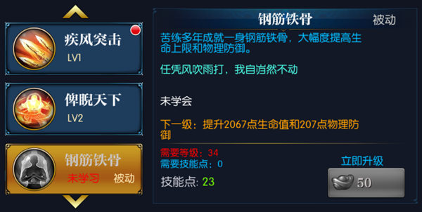技能除了玩家能在一定的等级获得的固定技能外,在41级61级81级还可以由玩家自己选择学习技能,自己选择有1个主动技能和4个被动技能,玩家可以自己随意进行选择搭配。技能学习之后,玩家获得技能点可以增加技能等级,增加技能等级的同时,也会增加大量战斗力。