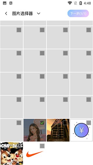 2、点击漫画脸进入图片选择界面,选中需要修改的图片,再点击下一步。