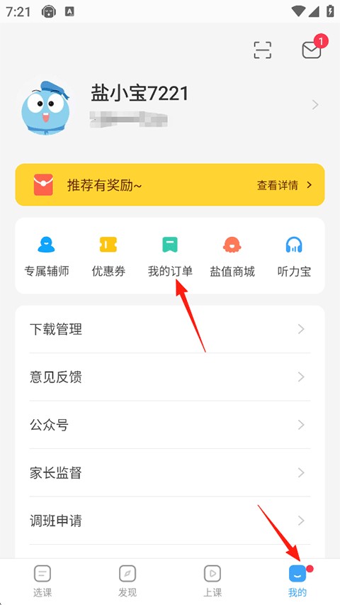 1、打开盐课堂网课软件,找到并点击“我的”板块,进入后选择“我的订单”。