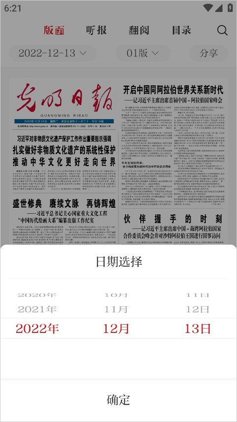 2、顶部 “版面” 可选择日期,沿用传统报纸排版,翻阅可转页,点击能放大版面内容。