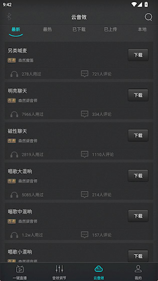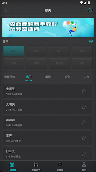 3、 云音效库:内置由专业调音师制作的云端音效资源,涵盖多种风格场景,用户可随时下载并免费使用,保持直播内容的新鲜感。