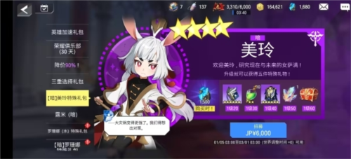 这个角色,如果新人想要长久的玩下去的话,建议一定要买,价格大约300左右,我没买是因为穷。(购买赠送1500晶石)